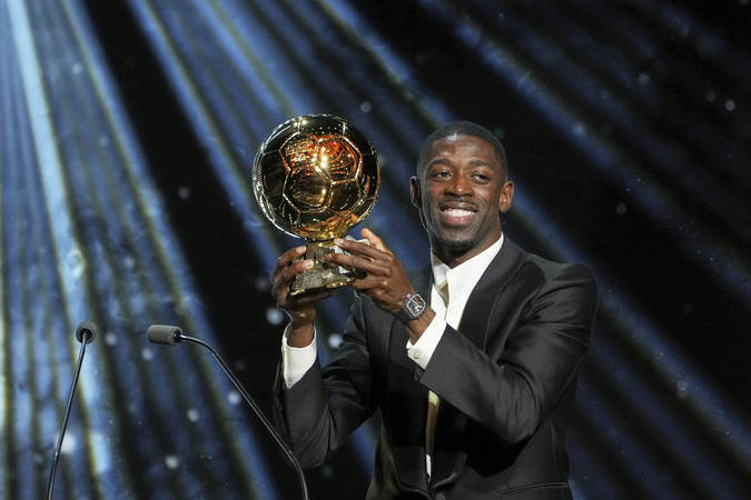 在巴黎夏特莱剧院的舞台中央,一直充当姆巴佩“绿叶”的登贝莱,比他的国家队队长先捧起了金球奖。